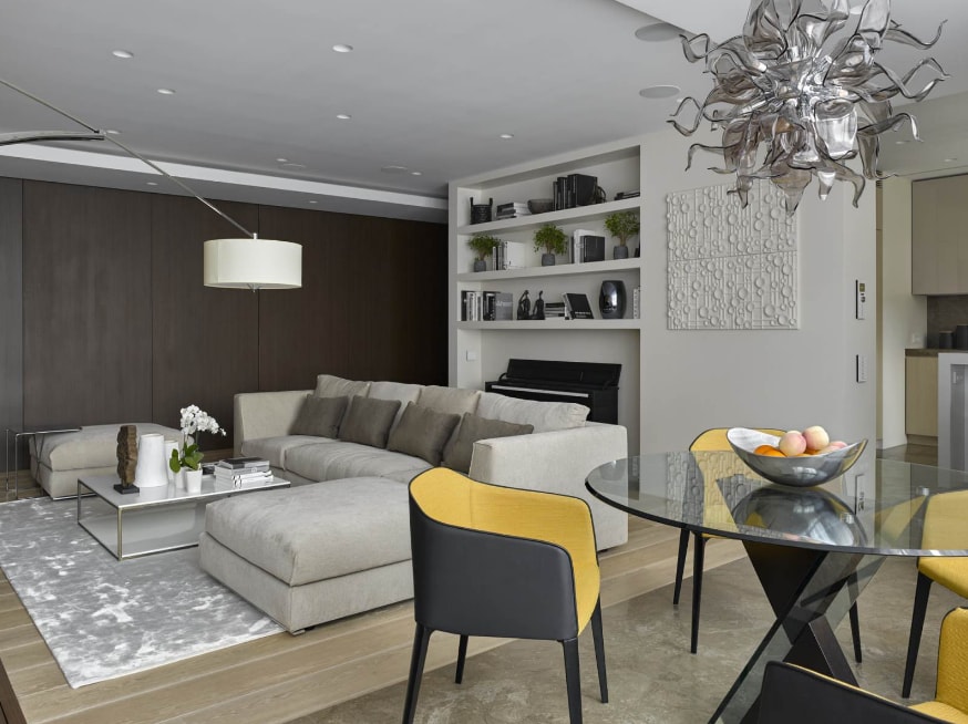 В большом помещении довольно часто для разделения пространства используют несколько элементов. К примеру большой обеденный стол и диван. Выглядит это очень органично, а общий вид при этом не перегруженный.