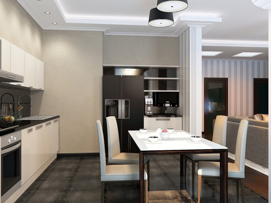 различное покрытие для пола – для кухни больше подойдет плитка, для зоны отдыха – ламинат, паркет или ковролин