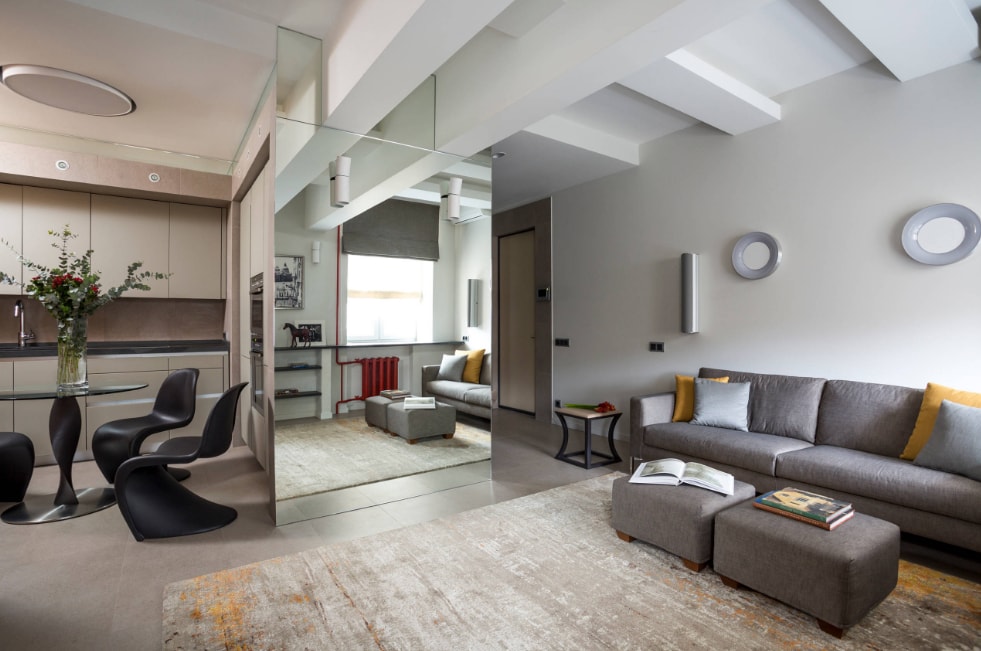 Гостиную расширит панорамное остекленение, множество зеркал и металлических деталей. На потолке: