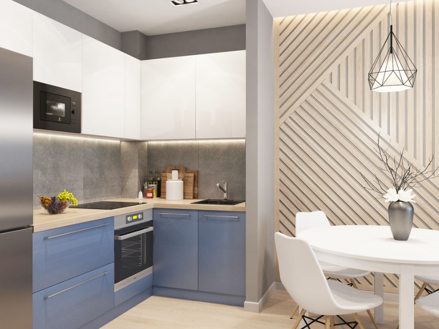 Будут популярны серые, бежевые, коричневые и голубые оттенки с черными и белыми акцентами. Светлая гамма подходит для основных стилей типа скандинавского, классического и неоклассического, а темная — к ар-деко, лофту и минимализму. Нужно помнить о том, что светлые стены визуально расширят площадь, а темные, наоборот, сузят. Чистый белый цвет для кухни будет крайне непрактичным выбором. Он быстро потеряет свежесть и потребует постоянного влажного ухода. Поэтому лучше выбрать светлые цветные тона.