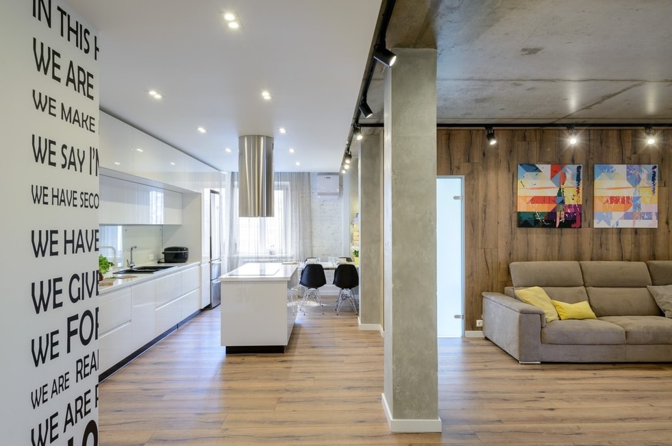 - различная отделка и уровень потолка — в жилой зоне он может быть гладким, а на кухне установлены балки с вмонтированным освещением, кронштейнами для посуды.