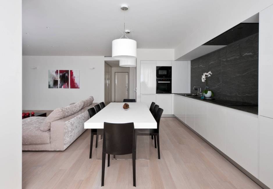 В числе достоинств такой планировки – большое свободное место, которое в кухне можно использовать для просторной столовой зоны.