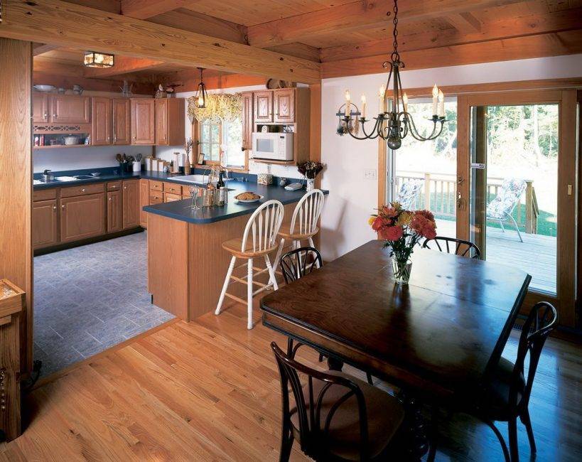 Мебельные гарнитуры из дерева, применение пестрых салфеток и ярких клетчатых занавесок добавляют уют и непринужденность. Оттенки в интерьере – приятные глазу и чистые.