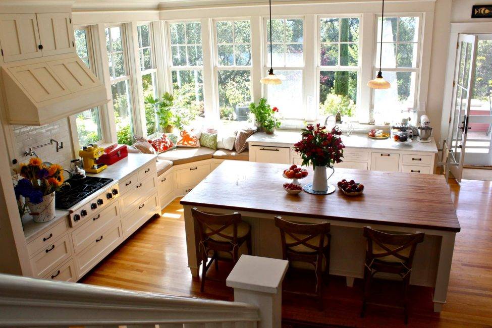 Около окна ставят обеденный стол или низкий ящик. Можно у оконного проема расположить рабочую зону с мойкой. В большой по площади кухне посредине помещения ставят стол-остров, то есть функциональный объект, включающий мойку или плиту, рабочую зону и обеденный стол.