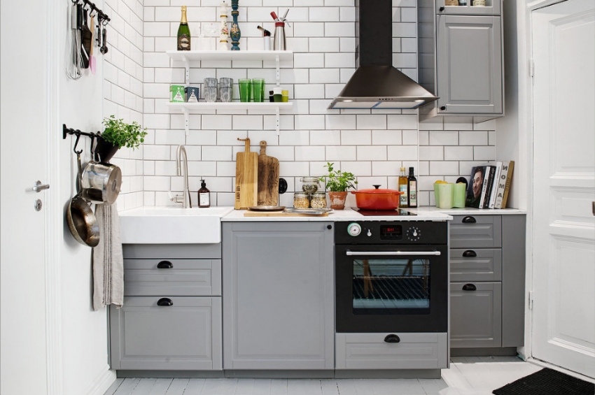 Дополнительное место для хранения вещей на маленькой кухне можно обеспечить, используя разнообразные полки и крючки