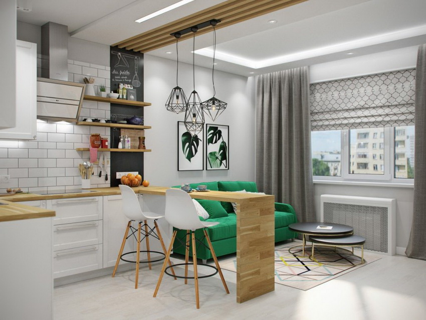 - Используемая вместо стола барная стойка – тоже неплохой вариант. Грамотно скомпонованная, она может вместить за собой 4-5 человек. Ножки столешницы ли, стола ли могут быть хромированными, фигурными деревянными или гнутыми опорами.