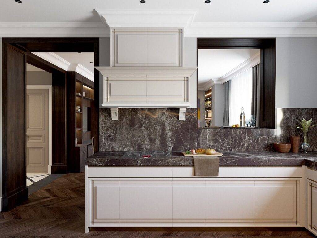Собственно, можно поделить на условно 2 вида: роскошно-вычурная, с множеством декорирующих элементов, и более спокойная, строгая и изящная, с простыми формами. От этого выбора зависит и остальной декор помещения кухни, который должен быть под стать мебели. Пространство над плитой оформляется в виде каминной полки, которая скрывает вытяжку. Возможно применение открытой вытяжки, но для кухни-классики лучше, если она будет выдержана в каминном стиле.