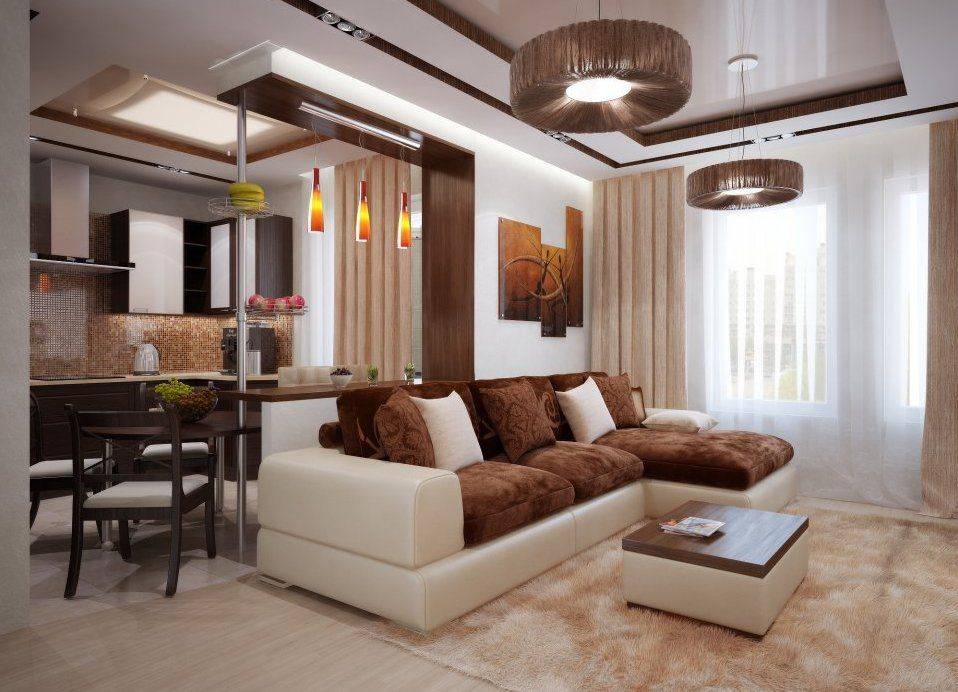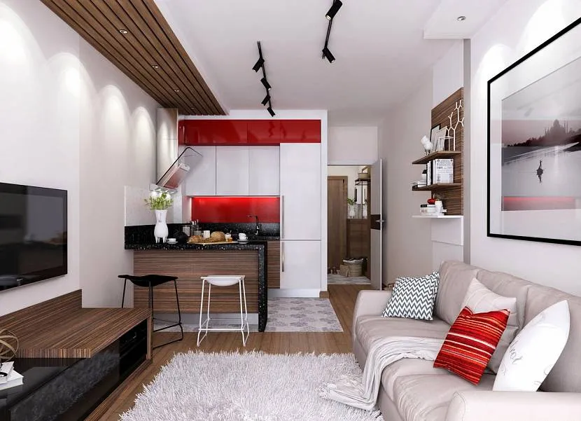 Современная гостиная с кухней может быть получена путем сноса стены между комнатами. Если у вас темная и тесная кухня в квартире, это будет оптимальным решением. Чтобы придать смежным помещениям целостный дизайн интерьера, стоит применять одно и то же напольное покрытие и поддерживать постоянные цвета. Современная кухонная мебель имеет элегантные фасады, которые могут дополнять или контрастировать с выбранной мебелью для комнаты. Однородная кухонная мебель менее заметна, благодаря чему она не будет доминировать в гостиной.