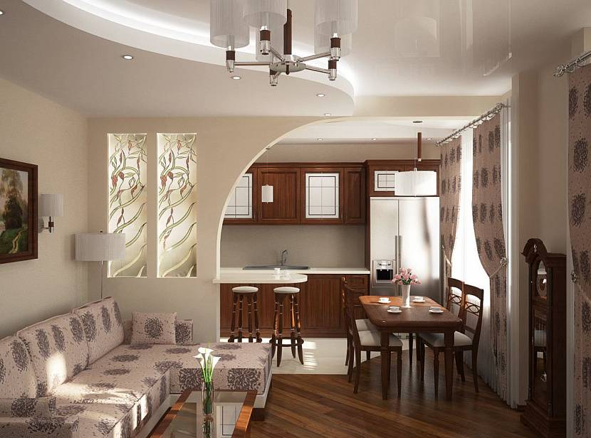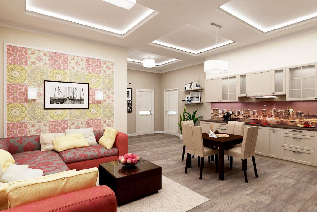 Многоуровневый потолок и пол. Пространство визуально не будет восприниматься одним целым, если в одной из частей объединенной гостиной 19 кв. м установить навесной или натяжной потолок, отличный по материалу или цвету. Аналогичный эффект возникает, если сделать подиум в одной из частей помещения. Его можно украсить встроенными светильниками, а, если вы поклонник практичных решений, то организовать в нем ящик для хранения различной мелочевки.