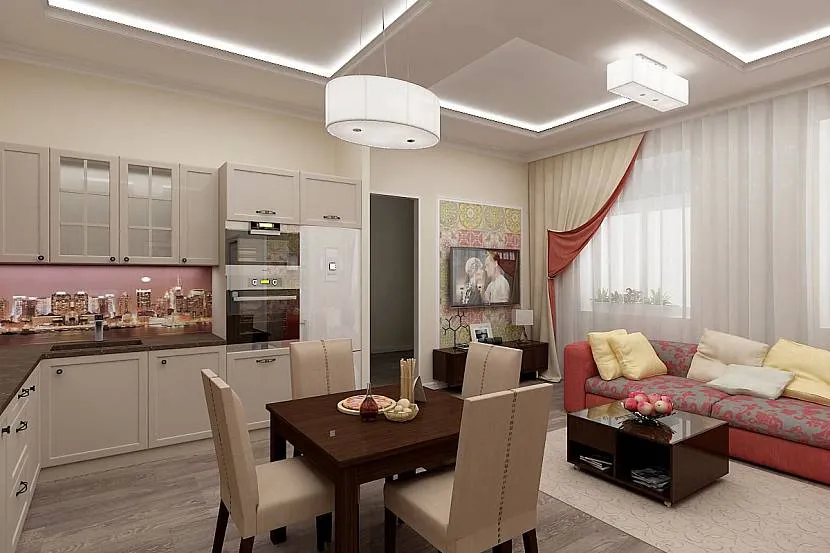 Интерьер кухни гостиной 20 кв.м может разграничить эти две комнаты, разделив их, например, столом со стульями, кухонным островком или барной стойкой. Вы также можете выделить зону, используя разные стеллажи или многоуровневый потолок с подсветкой. Стоит организовать нейтральные цвета в качестве основы. Сильные цветовые акценты используются в виде дополнения. Простым и недорогим способом будет легко изменить расположение гостиной с кухней без замены мебели или покраски всего помещения. Все, что вам нужно сделать, это поменять аксессуары, перекрасить одну стену, чтобы интерьер приобрел новый облик.