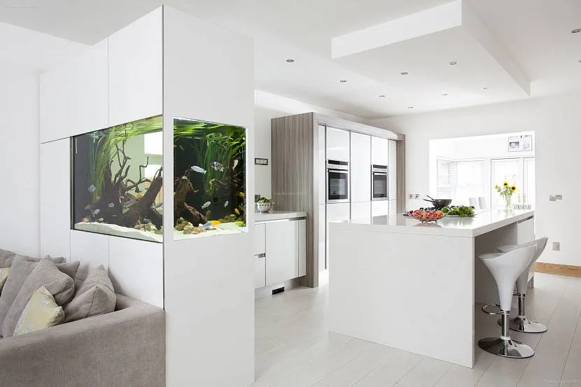 Аквариум-разделитель. Оригинальный способ разграничить пространство, только если в семье имеется неравнодушный к аквариумам человек. Понадобится аквариум шириной до 40 см, установленный на прочное основание. Конструкция получается декоративной благодаря полупрозрачности, но требует внимания, ухода и дополнительных трат.