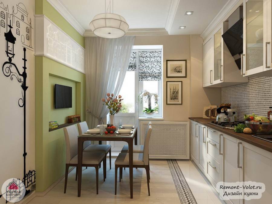 С одной стороны девять метров не позволяют слишком сильно развернуться с дизайном и выбором стиля для интерьера. Но с другой такая квадратура дает возможность спокойно распределить по комнате гарнитур, холодильник и кухонный стол со стульями.
