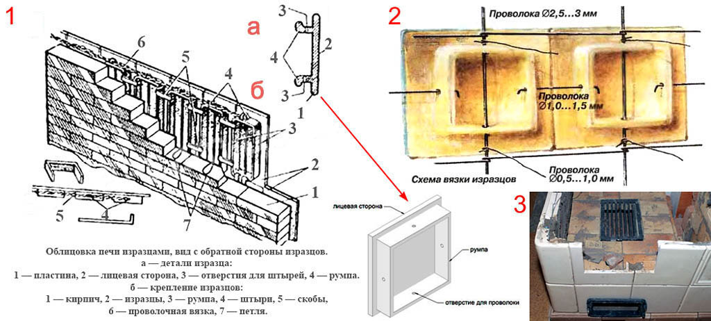 Облицовку изразцами ведут порядово, связывая изразцы стальными штырями и проволокой. Как правило, печь облицовывают изразцами в порядке ее постройки, причем облицовка должна все время опережать кладку, как показано на поз. 3. В таком случае вязку изразцов делают с анкерными петлями, как на поз. 1б. Отдельные мастера (качественно – немногие) умеют облицовывать изразцами ходовые печи; в таком случае вязку делают с анкерными штырями, поз. 2.