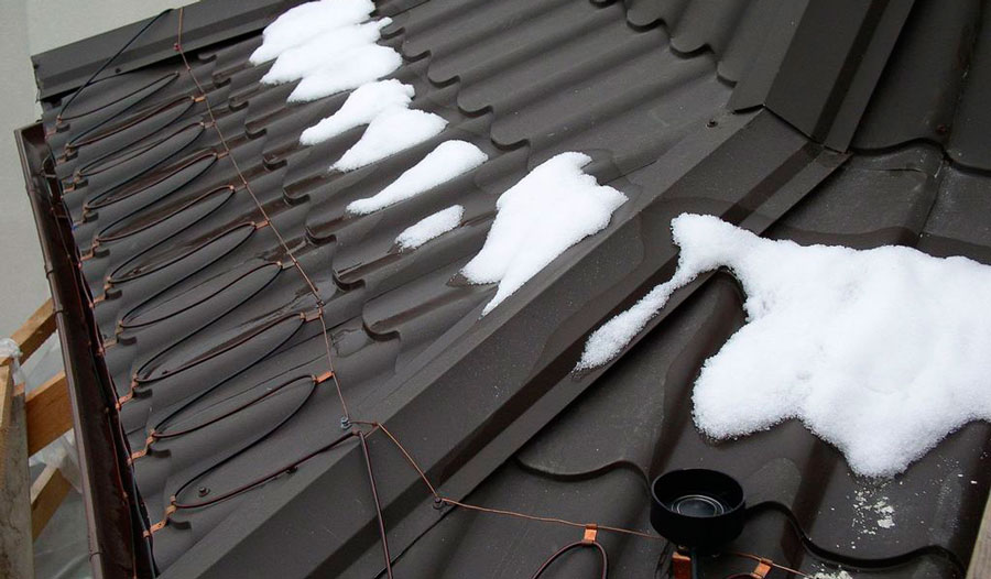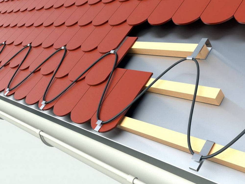 На кровлях со скатами применяется кабельный обогрев. Отопительный провод монтируется на свесах, ендовах, желобах и в водосточных трубах. Талая вода по ним стекает в ливневую канализацию.