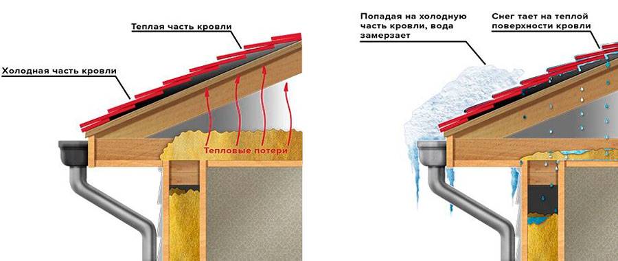При наличии слоя теплоизоляции даже в морозы снег на крыше подтаивает, стекая вниз и замерзая на холодных элементах кровли, образуя наледь. Здесь, кроме защиты водостоков, обогрев кромки крыши является обязательным требованием, усложняя и удорожая систему обогрева.