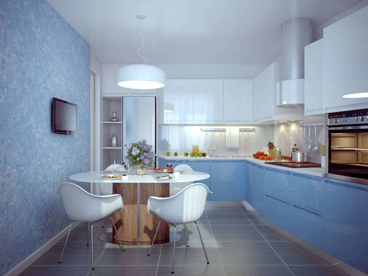 Чтобы помещение не напоминало стерильную операционную или лабораторию, к нему необходимо добавить несколько ярких цветовых оттенков. Например, украсить окна голубыми занавесками, обустроить фартук в голубых тонах, установить голубые стулья и обеденный стол.