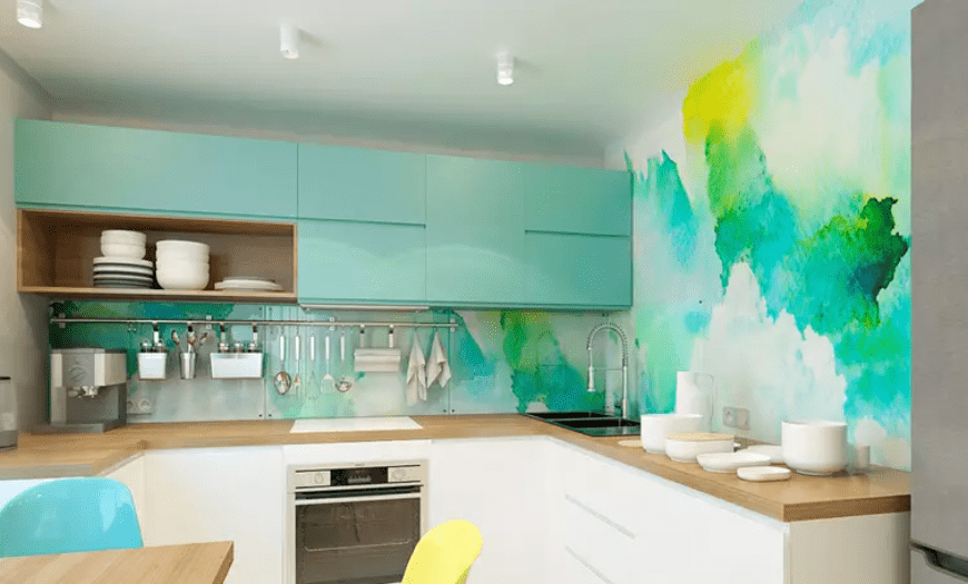 Именно поэтому в интерьере кухни чаще всего используют плитку, стеклянные панели или водостойкие краски, ведь их можно мыть, не опасаясь их повредить.