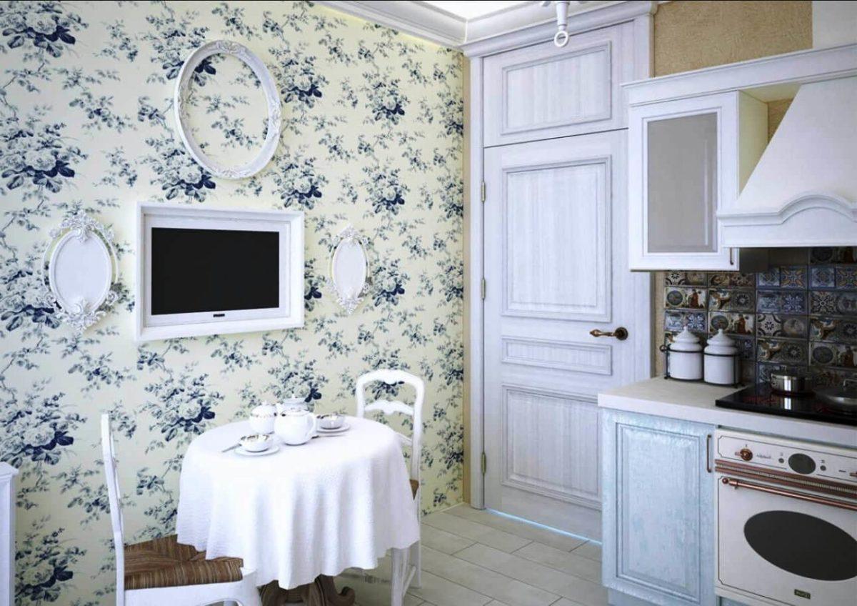 - Шпалеры с неяркими узорами облегчают обстановку, наполняют её воздухом. В итоге кухня выглядит более просторной.