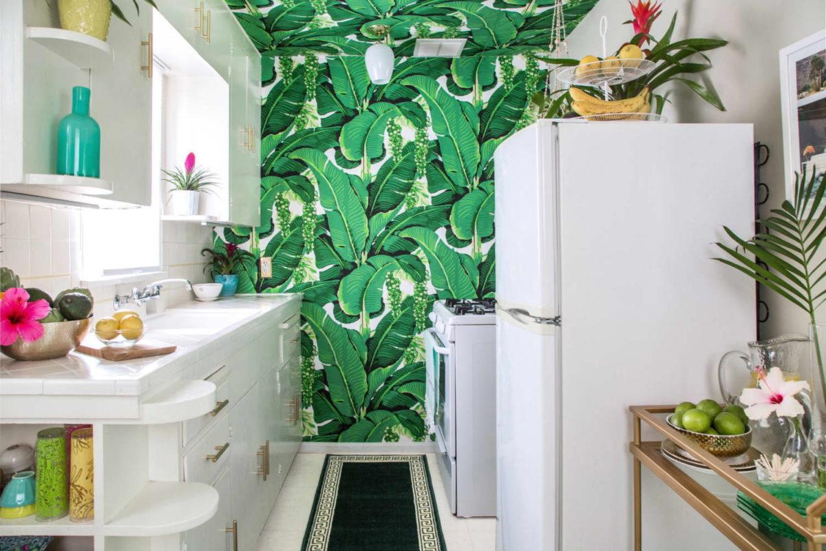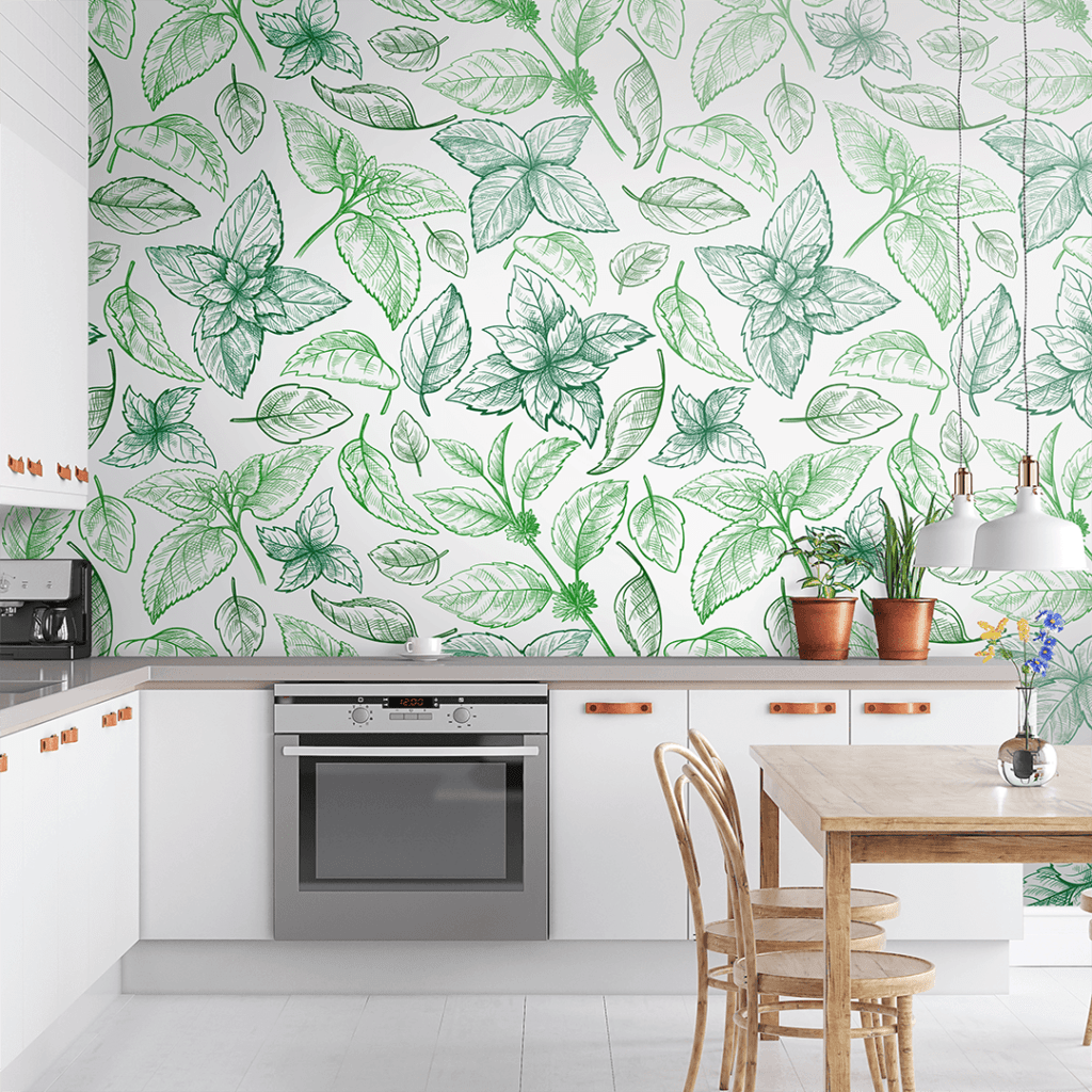 Изображения листвы, веточек, деревьев и прочей зелени тоже популярны. На фото эти модные обои для кухни 2021 выглядят очень свежо, добавляют в интерьер нотку эко.