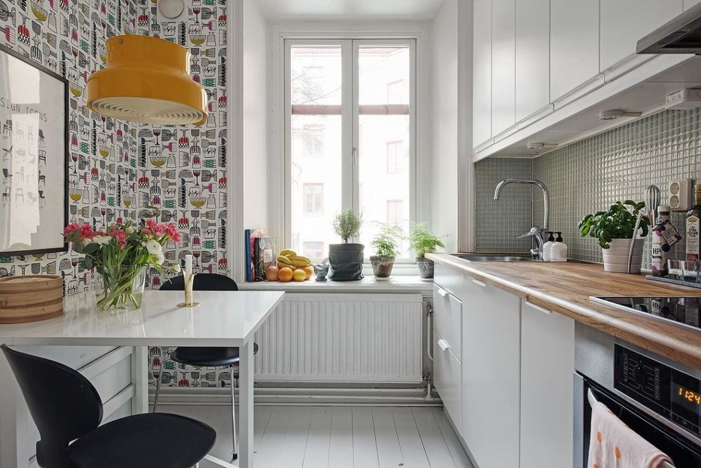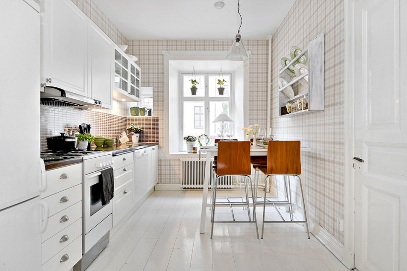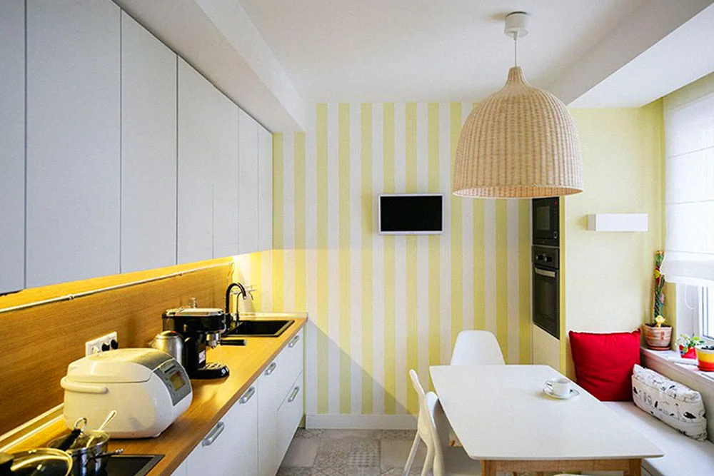 - Узкая кухня станет шире, при оформлении стен в светлых тонах и рисунке в продольную полоску;