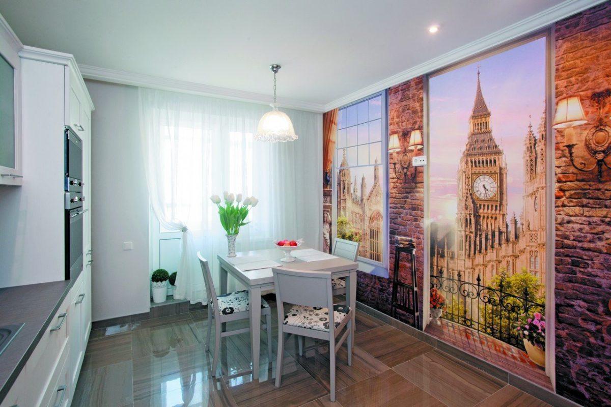 Зрительно увеличить комнату помогут фотообои, на которых изображено продолжение помещения. Это может быть широкий балкон, терраса или длинный коридор, распахнутое окно с видом на море, и так далее. В таком случае кухня сразу же приобретает более широкие границы.