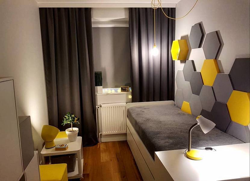 Геометрический рисунок идеален для маленьких спален: с его помощью можно увеличить не только границы пространства, но и высоту потолков.