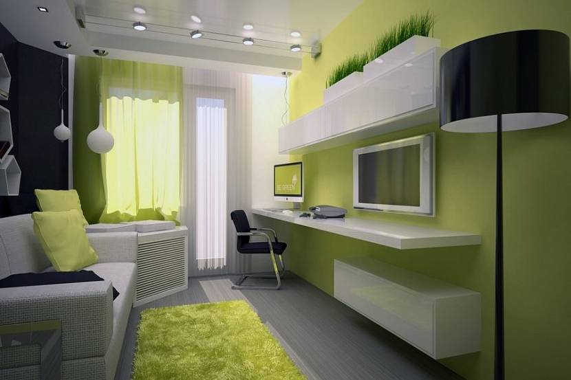 Дизайн маленькой комнаты требует использования не более одного-двух цветов. Несколько разных или контрастных цветов делают помещение загруженным, зрительно уменьшают пространство. Мебель и аксессуары подбирают в одной цветовой гамме со стенами и полом.