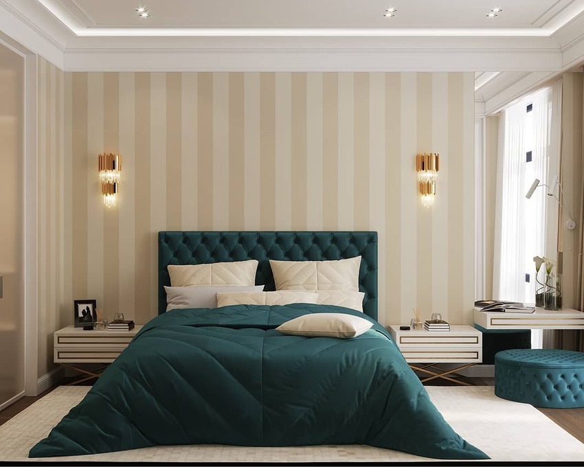 Размещение орнаментов или принтов по диагонали работает на визуальное увеличение комнаты. Это происходит за счет формирования эффекта удлинения пространства. Спальня визуально становится более большой и комфортной. Чаще всего для этого используются обыкновенные полосы.