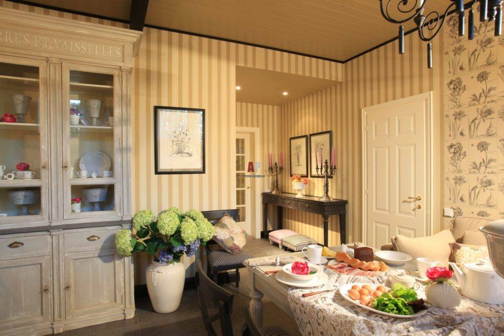 Их можно мыть не боясь, поэтому для рабочей зоны – идеальный вариант. Так, к примеру, Вы можете вроде бы и плитку увидеть на стене, но это лишь имитация под нее. А очень необычно будет выглядеть часть стены, по кругу окна, а также около люстры, сделанные в старинном стиле.