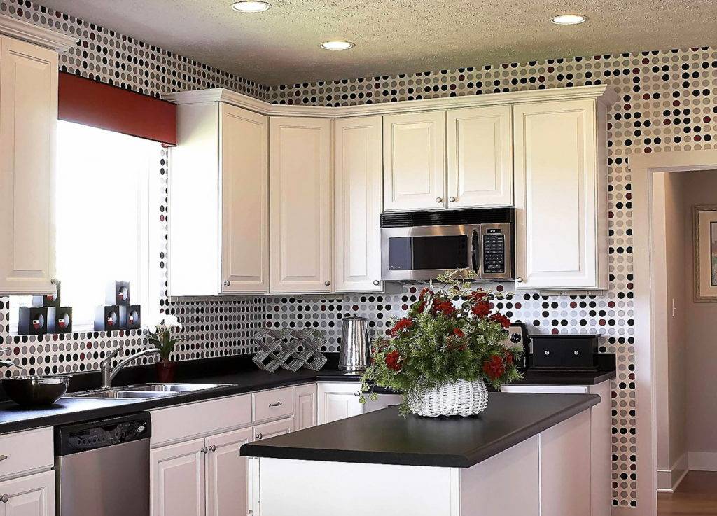 Ключевая особенность такого пространства — лаконичность, сочетающаяся с яркостью и изяществом. Вот почему этот стиль считается универсальным и наиболее простым в реализации. Традиционное решение для него — использование обоев черно-белого оттенка на кухне. Они вряд ли обеспечат живую обстановку в помещении, но выступят прекрасным фоном для любых аксессуаров и мебели.