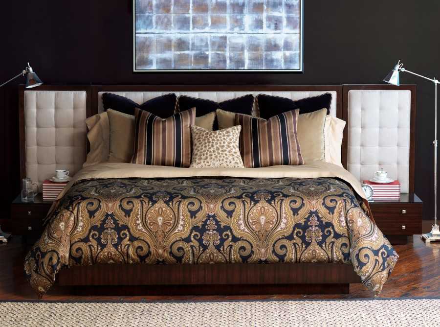 Стена, отделанная тканью, становится центральной во всей комнате и привлекает к себе основное внимание