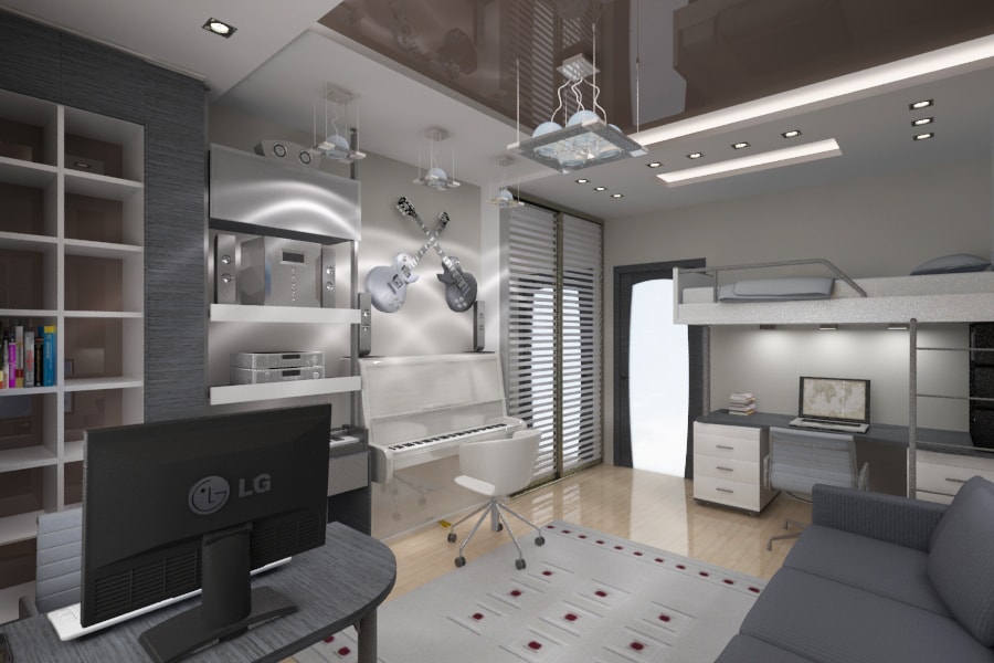 Органично впишутся в такой интерьер торшеры в индустриальной и хай-тек стилистике. При помощи освещения легко транспортировать обычную комнату в интерьер, о котором мечтает любой подросток.