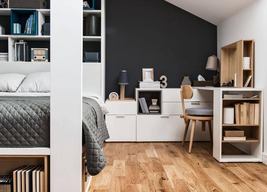 Если комната для подростка обладает небольшими размерами, отдавайте предпочтение модульной меблировке, оформленной в одной цветовой палитре.