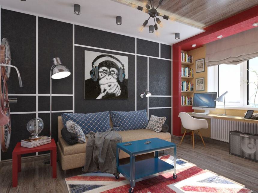Работая над интерьером подростковой комнаты помните, что он прежде всего должен быть функциональным: здесь он будет учиться, отдыхать, встречаться с друзьями и заниматься своим хобби. Поэтому лучше зонировать пространство, чтобы ваш сын чувствовал себя комфортно.