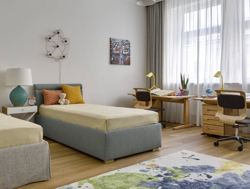 Во-первых, у каждого ребенка должно быть полноценное спальное место. Это должны быть кровати, поскольку на диване детям и подросткам спать еще не рекомендуется. Помимо личного пространства, в такой детской будут общие зоны – место для игр, стол для занятий (если позволяет место, лучше установить два письменных стола).