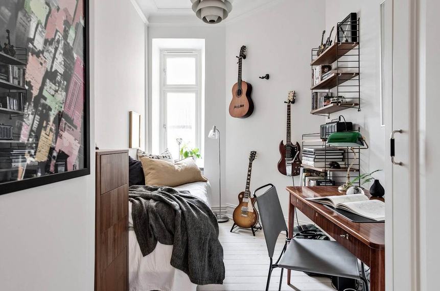Если подросток любит музыку, то его личное пространство можно оформить в этом направлении. Стены украсьте плакатами с известными музыкальными исполнителями.