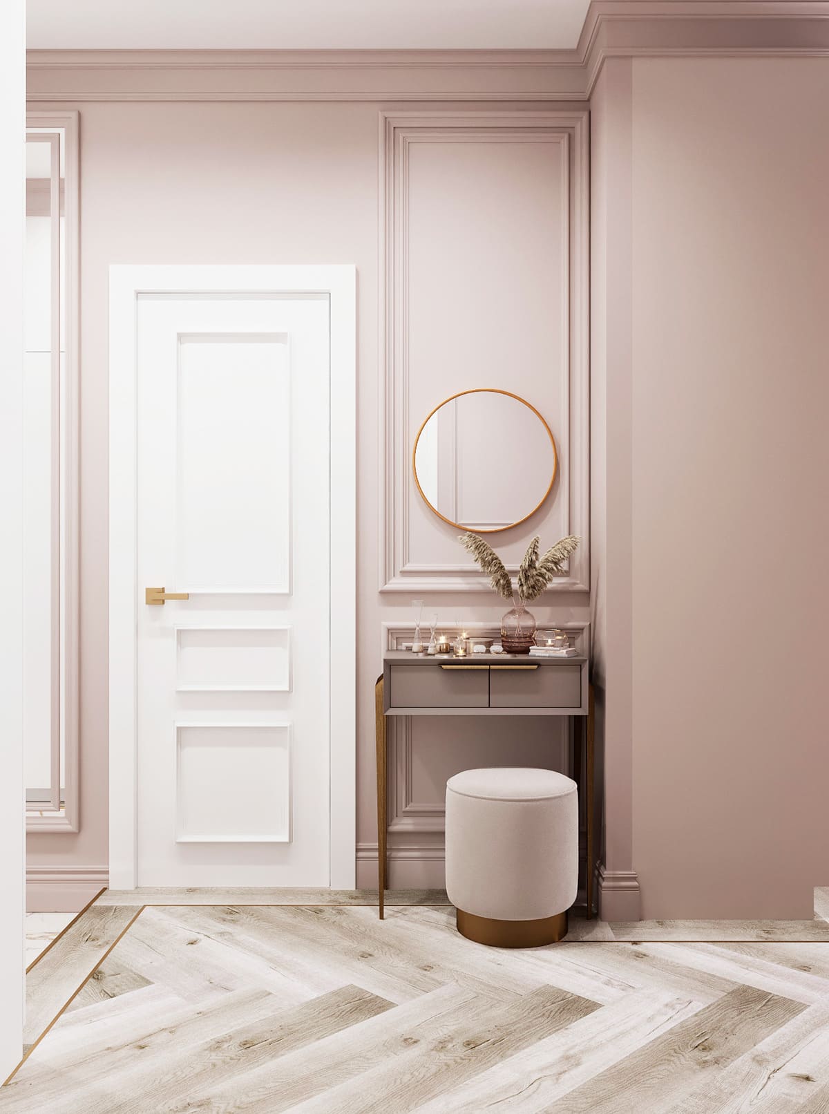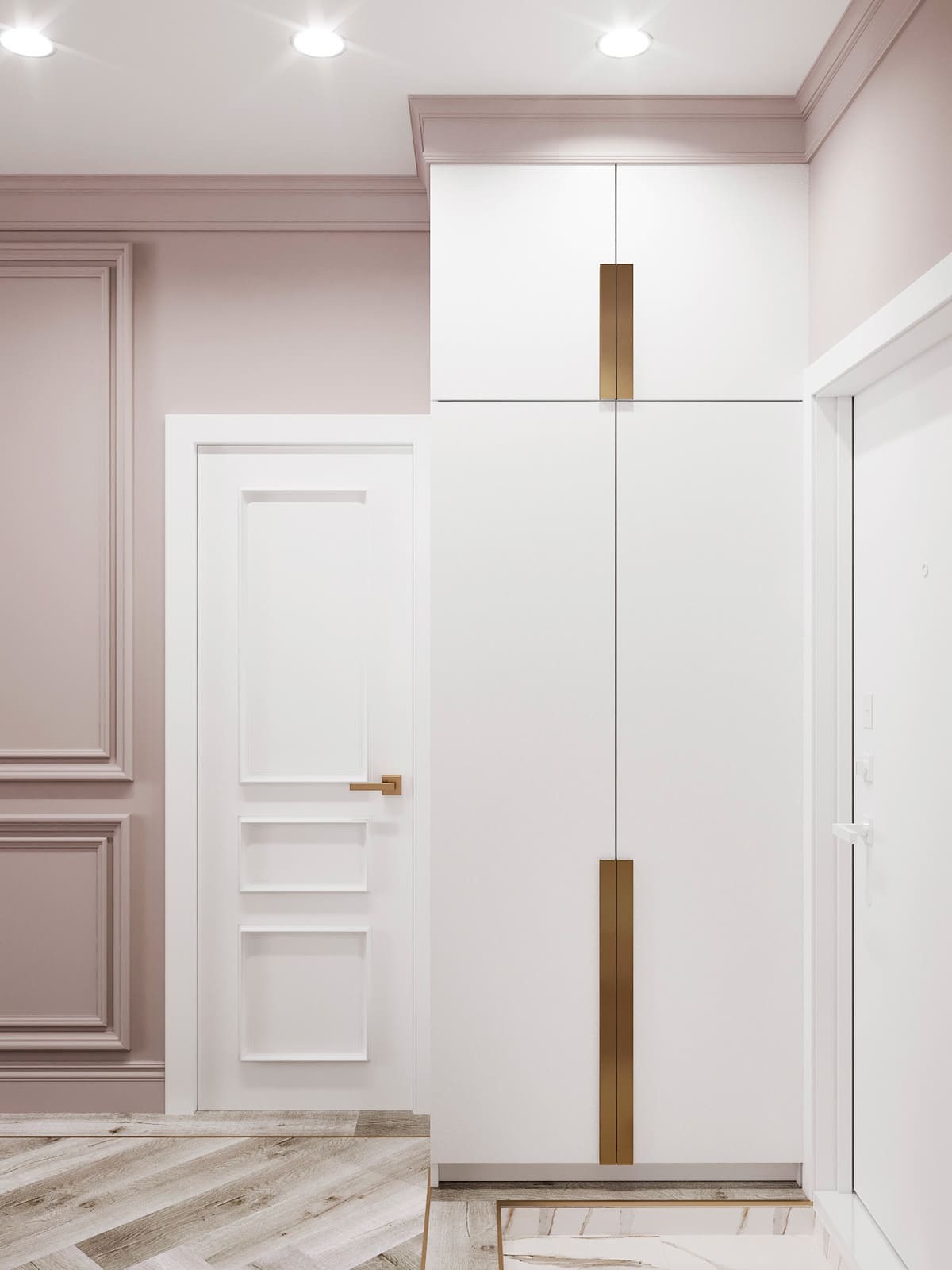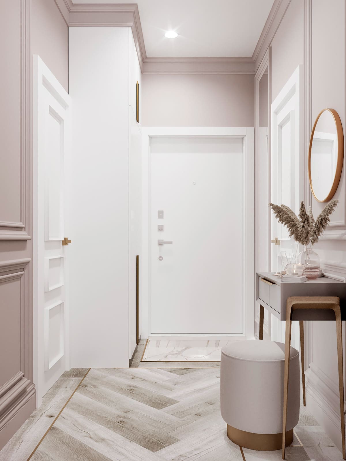 Когда каждая комната квартиры выполнена в своем уникальном стиле и разнообразие бьет по глазам, прихожая создается в сдержанных тонах. Однотонность либо поверхность под покраску только приветствуется.