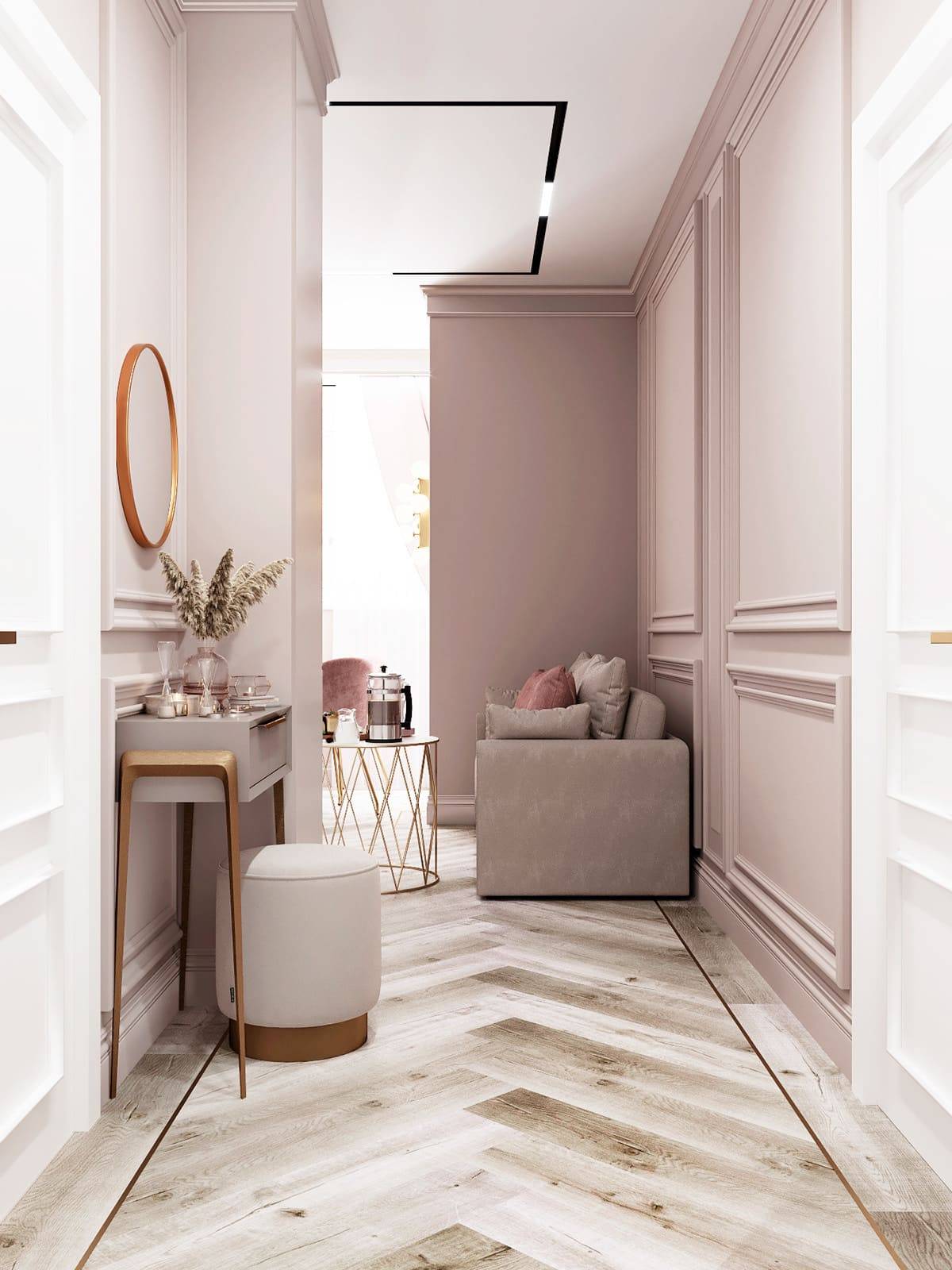 - Уменьшение потребности в дополнительном освещении. В коридоре обычно нет оконных проемов, поэтому он может выглядеть темным и мрачным при недостатке осветительных приборов. Оттенки белого, бежевого и слоновой кости способны визуально усилить освещение, в результате можно значительно сэкономить на электричестве.