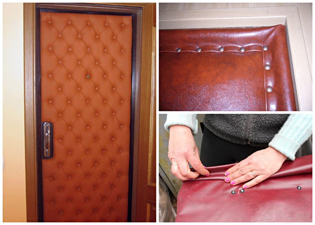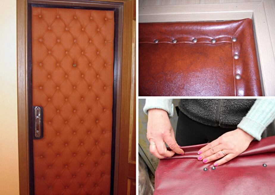 В поисках того, чем же еще обшить входную дверь, традиционно принято использовать искусственную кожу. Такой вариант улучшает звукоизоляцию помещения. Проводятся следующие операции: