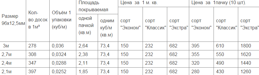Ниже приведена таблица, по которой можно узнать, сколько кв. м пиломатериала в 1 куб м, а также высчитать количество дощатых упаковок, где одна состоит из 10 панелей вагонки. По нижеприведенной таблице можно найти ориентировочную стоимость отделки.