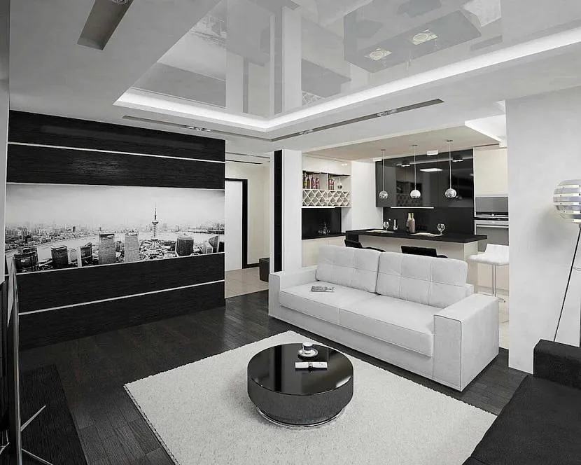 Интерьер гостиной и кухни в черно-белом оформленииИсточник dizainall.com/