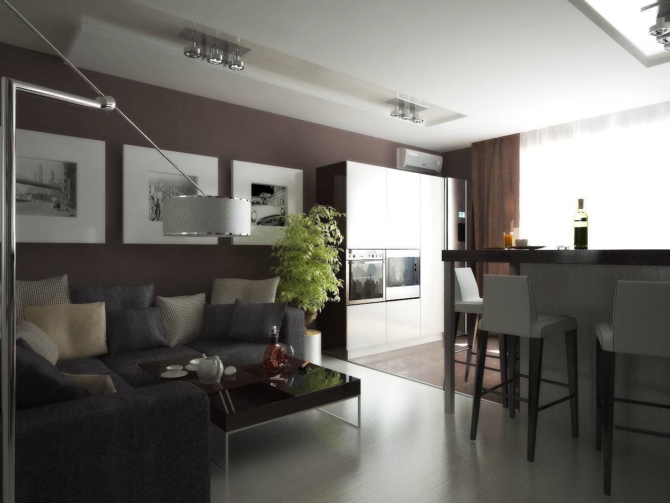 При демонтаже стены все коммуникации и одно окно остаются на своих местах, поэтому зону кухни тоже не требуется переносить. А вот площадь можно разделить на зоны по своему желанию. Но обычно под кухню выделяют не более 20-25% помещения, все остальное отводится под гостиную.