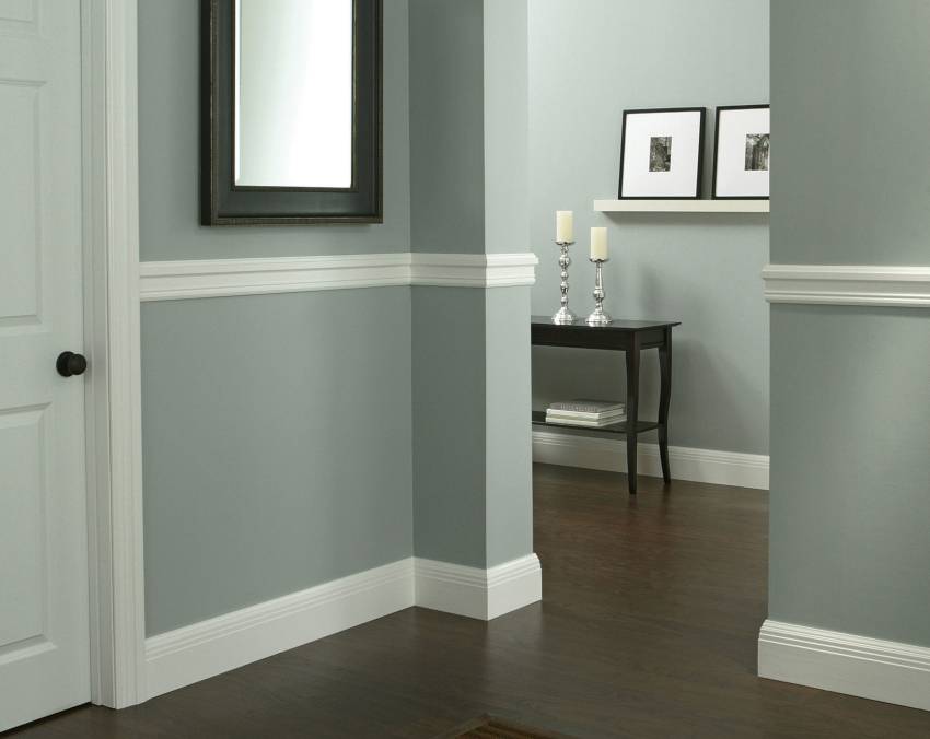 - Плавный переход в отделке стен материалами, контрастными по цвету. Такое преимущество молдингов обеспечивается благодаря их легкой окраске. Их можно покрыть краской различных видов и любого цвета.