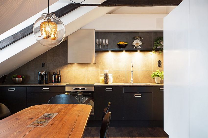 Если установлена колонна для кухни, пенал не должен загромождать комнату и подходить по размеру по высоте. Конечно, если для кухни лофт подбирается мебель, то особых сложностей и ограничений в выборе нет, но для небольшого помещения подобрать мебельную продукцию гораздо сложнее.