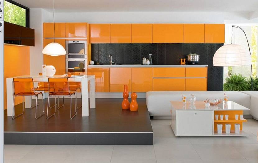 - если же комнату надо сделать визуально шире, то цветом апельсина отделывают несколько стен или хотя бы их части, например, фартук;