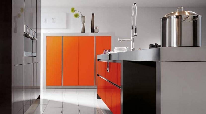 Дизайнеры полагают, что оранжевый абсолютно не вписывается в нарядную гостиную или затемненную комнату для сна, а вот его применение для модной кухни – вполне грамотное решение. Броские колеры цвета зрелого апельсина будут прекрасно восприниматься обывателем