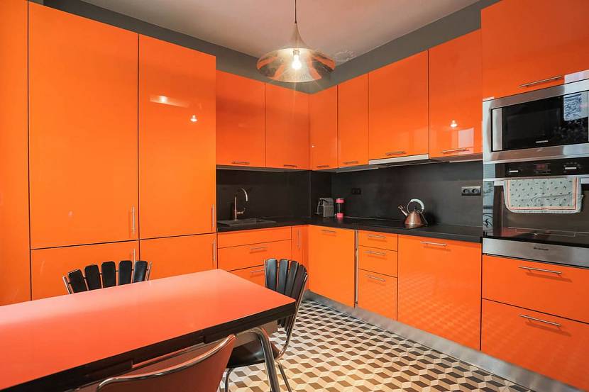 - Оранжевый учащает пульс и будто «согревает». В осенне-зимний период он не позволит скуке и хандре одолеть вас, ведь с такой яркой кухней грустить из-за серости на улице точно не придется.