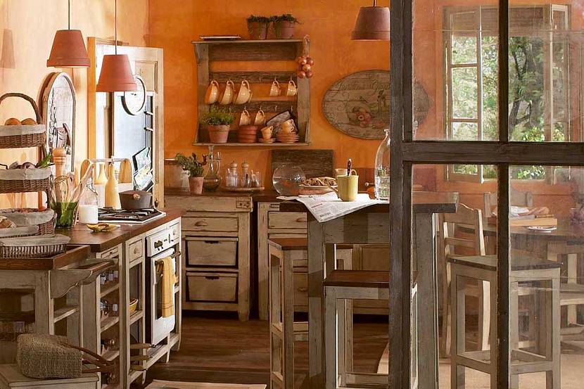 оранжевый цвет стен сочетается с натуральным деревом гарнитура;