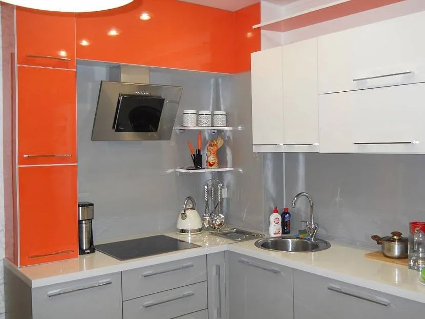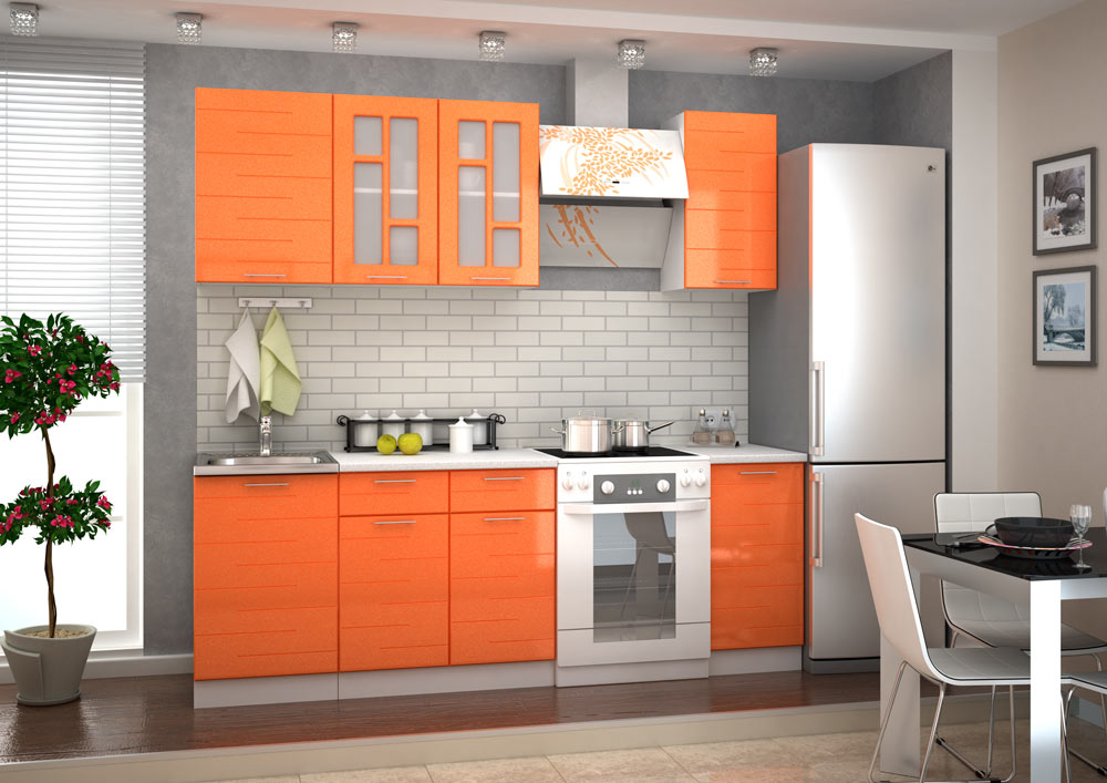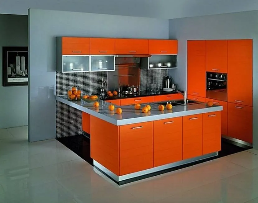 Для создания оригинального дизайна используют модульный гарнитур с глянцевым фасадом в оранжевом цвете. Менее ярко смотрятся модели с белыми или серыми дверцами и апельсиновыми стенками. Подчеркнуть красоту теплой гаммы поможет металлическая фурнитура и кромка из алюминия.