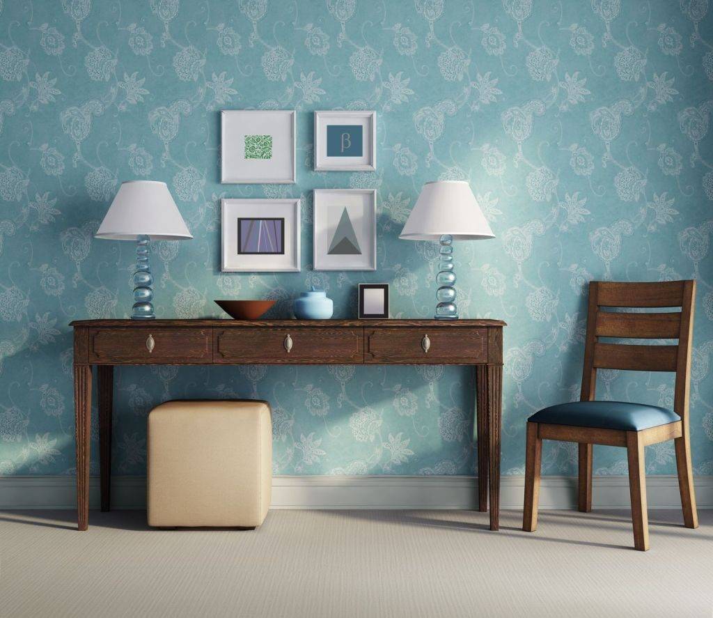 Дизайн приобретет великолепность, если на фоне обоев синего цвета добавить в интерьер серебристые декоративные подушки, напольные или настольные вазы.